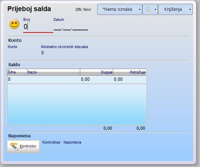 Ovaj dokument je bio razvijen u starom modulu 'Financijsko*', u kojem nije bilo moguće djelomično zatvaranje stavaka. Budući da novi modul 'Financijsko' omogućuje i djelomično zatvaranje stavaka, ovaj dokument više nije neophodan, ali još može biti koristan kod onih korisnika koji ne žele u slijedeću poslovnu godinu prenositi sve otvorene stavke pojedinačno, nego samo saldo računa u jednoj stavci, pa smo ga iz tog razloga ostavili uključenog i u novom modulu.