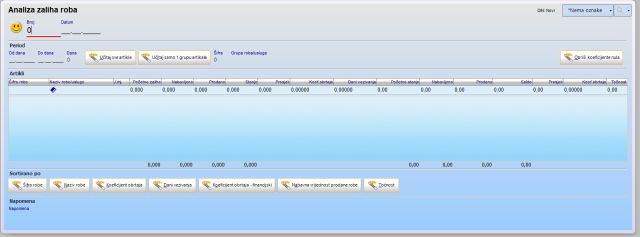 Na temelju prodanih količina i prosječnog stanja zaliha, program za svaki artikal izračunava koeficijent obrtaja robe. Kod ovog pokazatelja poželjan je što veći broj, jer on pokazuje koliko se puta prosječne zalihe okrenu na skladištu u zadanom periodu. Na primjer, koeficijent 10 znaći da se prosječne zalihe nabave i prodaju 10 puta u zadanom periodu. Koeficijent 0.1 znači da se samo 10% prosječnih zaliha proda u promatranom periodu.