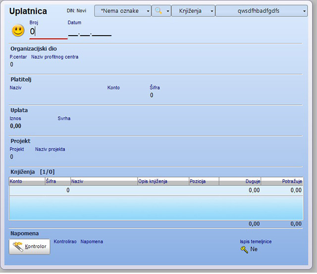 Za korištenje dokumenta Uplatnica, potrebno je prvo dokumentom Blagajna definirati jednu ili više blagajni za koje ćete raditi knjiženja. (Dokument Blagajna je selektor dokumenta Uplatnica). Ako je definirano više od jedne blagajne, tada prije početka rada s dokumentom Uplatnica odaberite blagajnu za koju vršite knjiženje. Izbor blagajne se nalazi u gornjem desnom kutu dokumenta Uplatnica.