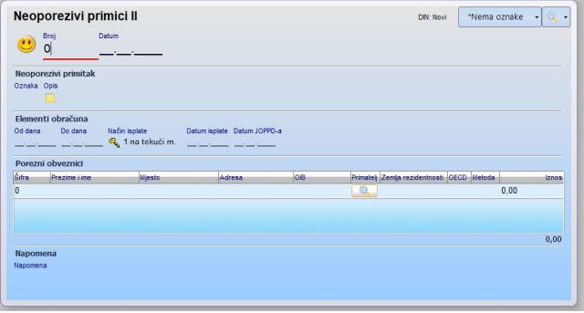 Dokument Neoporezivi primici II namijenjen je za prijavu neoporezivih primitaka u JOPPD obrazac, kada se oni isplaćuju odvojeno od drugog dohotka, ili se isplaćuju na drugačiji način.
