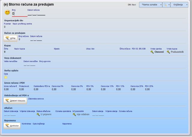 Dokument (e) Storno računa za predujam namijenjen je za storniranje ranije ispostavljenih (e) Računa za predujam. Storniranje se obavlja istovremeno s izdavanjem konačnog računa za robu/uslugu koja je plaćena predujmom.