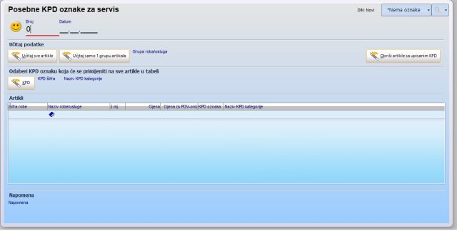 Ako naknadno želite izmijeniti KPD oznaku na nekom od artikala, pokrenite novi dokument 'KPD oznake za servis', u zaglavlju odaberite novu KPD šifru, a u tabelu artikala ručno upišite (ili automatski učitajte npr. cijelu grupu roba) šifre roba čiju KPD oznaku želite promijeniti.