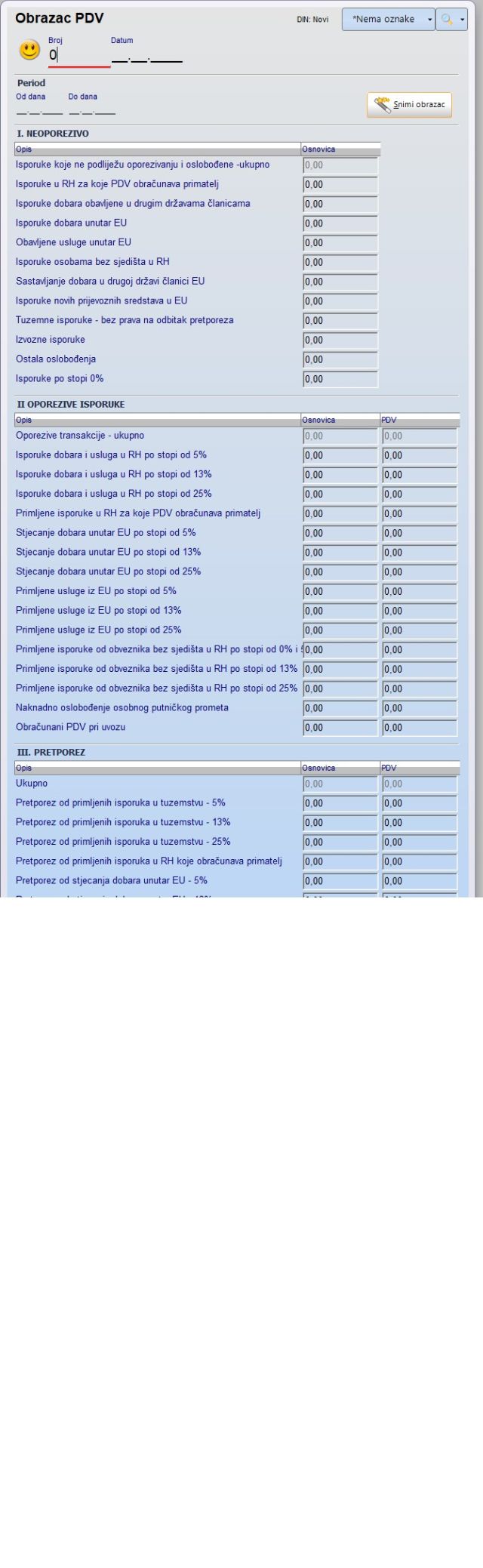 Nakon što upišete period za kojeg se radi obračun, program će automatski učitati podatke u obrazac, na temelju svih ručno i automatski proknjiženih dokumenata URA i IRA,