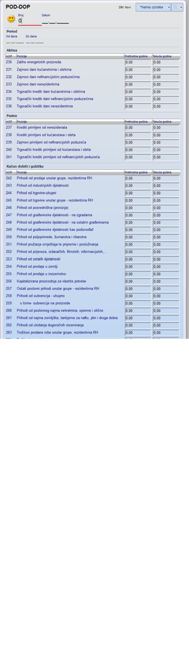 Podatke za POD-DOP program izračunava nakon što se upiše interval datuma za kojeg se radi bilanca. Podaci o prethodnoj godini automatski se učitavaju iz obrasca POD-DOP koji je upisan u knjizi prethodne godine, a koja je izrađena za isti interval datuma. Dakle, ako u knjizi prethodne godine imate izrađen obrazac POD-DOP za period od 01.01-301.12, onda ćete u obrascu ove godine, koji se radi za isti period,u stupcu 'Prethodna godina' dobiti podatke iz prethodne godine.