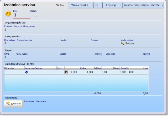 Dokument Izdatnica servisa služi za knjiženje izlaza rezervnih djelova sa skladišta.