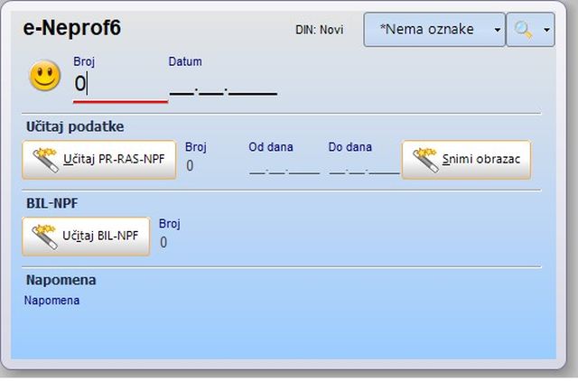 Prije izrade obrasca, potrebno je učitati odgovarajući PR-RAS-NPF i BIL-NPF obrazac, nakon čega se klikom na gumb 'Snimi obrazac' može izraditi excel datoteka.